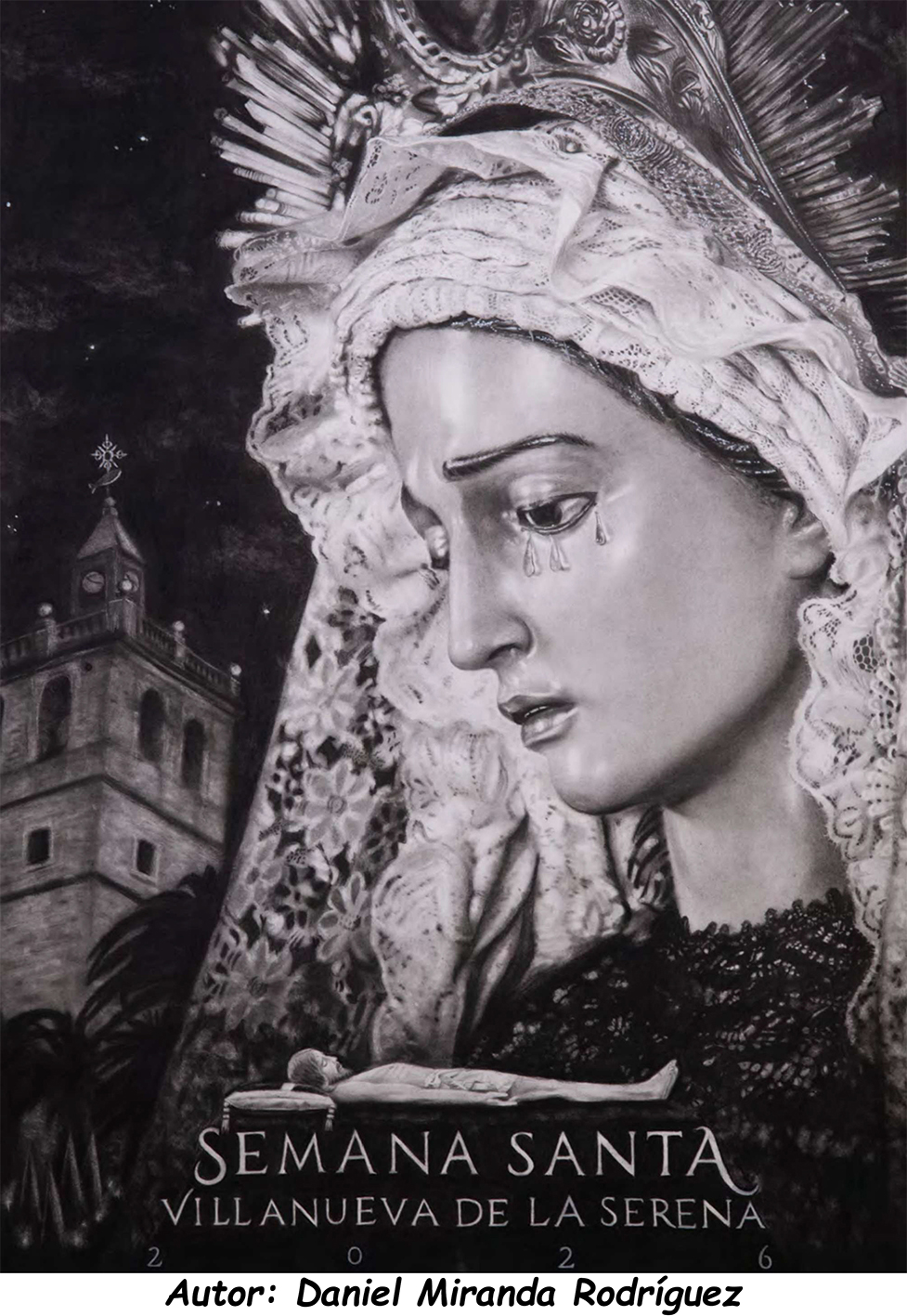 Cuando miramos el cartel del año 2026 y leemos las distintas noticias que se han publicado sobre el mismo, nos enteramos que se elige mediante concurso público, sometido a unas definidas reglas que, como no podía ser de otra manera, los participantes deben aceptar sin condiciones. Detrás de ese concurso hay una organización que, en nuestro caso, es la Junta de Hermandades y Cofradías de Villanueva de la Serena, institución en la que se encuentran representadas todas y cada una de las Hermandades y Cofradías de Pasión y Gloria de Semana Santa, cuyos miembros son los encargados de seleccionar, entre los trabajos presentados por distintos autores anónimos dentro del plazo establecido, el cartel oficial anunciador de la Semana Santa de Villanueva de la Serena en 2026. Cartel que es presentado en público en la gala “Una nueva Semana Santa” en el teatro Las Vegas de la ciudad, dándose a conocer su autor al que se le entrega el premio establecido.